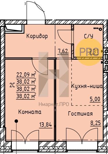 Общая площадь: 38.02 м2