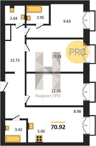 Квартира: 3 к 70,92 кв.м., 1 этаж в комплексе Твоя Привилегия, 3 очередь, корп.2.1, сдача: 1кв. , этажей: 4, адрес Екатеринбург г., Академический р-н, , Застройщик: СЗ 45-й Квартал.