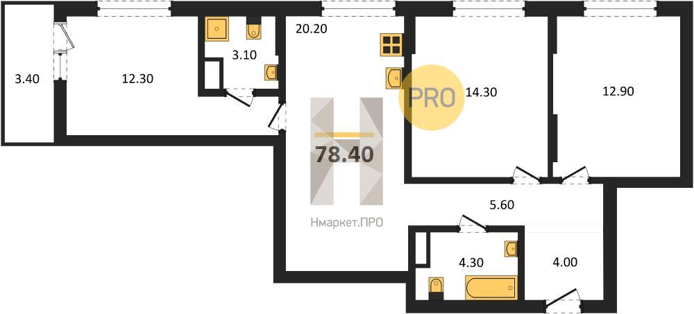 Квартира: 3 к 78,40 кв.м., 6 этаж в комплексе Курчатов, 1 очередь, корп.1, сдача: 4кв. , этажей: 17, адрес Екатеринбург г., Академика Красовского ул., , Застройщик: Талан.