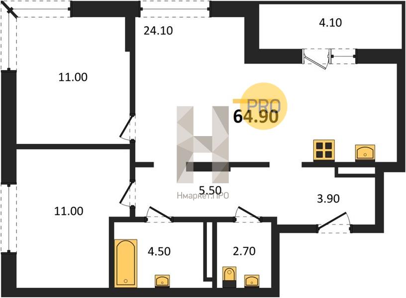 Квартира: 2 к 64,90 кв.м., 9 этаж в комплексе Курчатов, 1 очередь, корп.1, сдача: 4кв. , этажей: 17, адрес Екатеринбург г., Академика Красовского ул., , Застройщик: Талан.