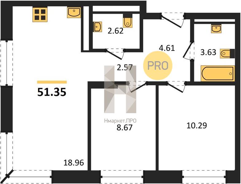 Квартира: 2 к 51,35 кв.м., 12 этаж в комплексе RAZUM в Академическом, 1 очередь, корп.2, сдача: 1кв. , этажей: 12, адрес Екатеринбург г., Академика Курчатова ул., д. 2, Застройщик: РАЗУМ.