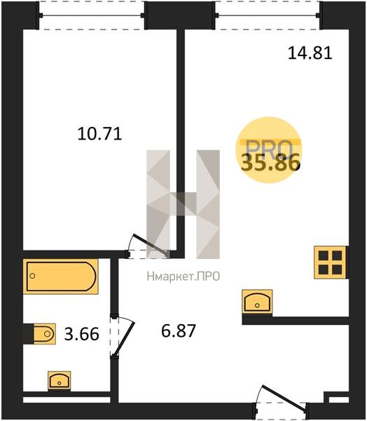 Квартира: 1 к 35,86 кв.м., 1 этаж в комплексе RAZUM в Академическом, 1 очередь, корп.2, сдача: 1кв. , этажей: 12, адрес Екатеринбург г., Академика Курчатова ул., д. 2, Застройщик: РАЗУМ.