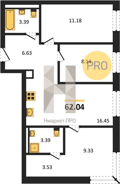 Квартира: 3 к 62,04 кв.м., 2 этаж в комплексе RAZUM в Академическом, 1 очередь, корп.2, сдача: 1кв. , этажей: 12, адрес Екатеринбург г., Академика Курчатова ул., д. 2, Застройщик: РАЗУМ.