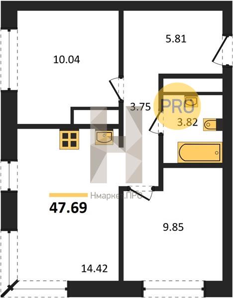 Квартира: 2 к 47,69 кв.м., 9 этаж в комплексе RAZUM в Академическом, 1 очередь, корп.1, сдача: 1кв. , этажей: 24, адрес Екатеринбург г., Академика Курчатова ул., д. 2, Застройщик: РАЗУМ.