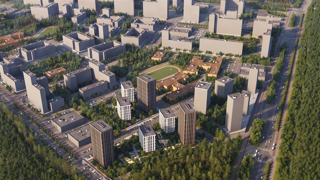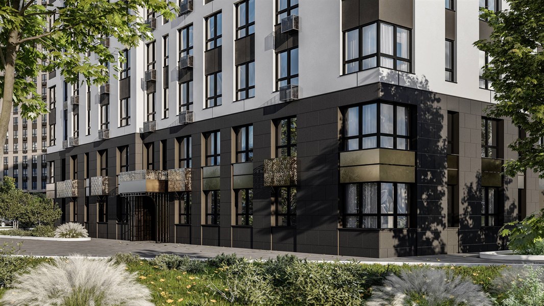 Современная архитектура комплекса переменной этажности. Благодаря низким этажам жилой комплекс наполнен теплым естественным светом, а высокие секции защищают от ветра. С высоких этажей открываются впечатляющие виды на эко-тропу и панораму района Академический. Арки придают интеллигентный образ домам. Сочетание разных фактур фасада формирует неповторимый архитектурный облик жилого комплекса. Отличительная особенность проекта – большие площади остекления. Отступ окна от пола 59 см. Оконные рамы выполнены в графитовом цвете. Рельефность фасада придает дому визуальную пластичность. Первые два этажа облицованы жидким камнем, что позволяет поддерживать эстетичный вид домов долгие годы. Композитные панели цвета латунь добавляют изящества фасадам. Природные, естественные цвета мокрого фасада дарят чувство спокойствия и гармонии.