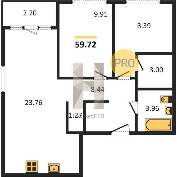 Квартира: 2 к 59,72 кв.м., 24 этаж в комплексе Amundsen, 1 очередь, корп.1, сдача: 1кв. , этажей: 24, адрес Екатеринбург г., Академика Ландау ул., , Застройщик: Прогресс.