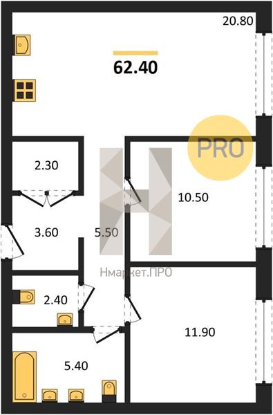 Купить 2-комнатную квартиру, 61.80 м2 № 6080434