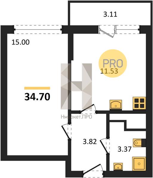 Квартира: 1 к 34,70 кв.м., 15 этаж в комплексе Старт, 1 очередь, корп.1.1-1.2, сдача: 1кв. , этажей: 25, адрес Екатеринбург г., Академика Вонсовского ул., , Застройщик: TEN девелопмент.