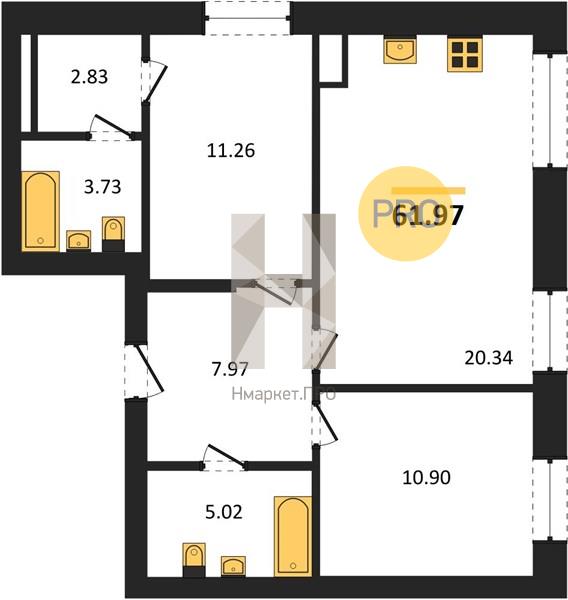 Квартира: 2 к 61,97 кв.м., 4 этаж в комплексе Amundsen, 2 очередь, корп.1, сдача: 2кв. , этажей: 24, адрес Екатеринбург г., Амундсена ул., , Застройщик: Прогресс.