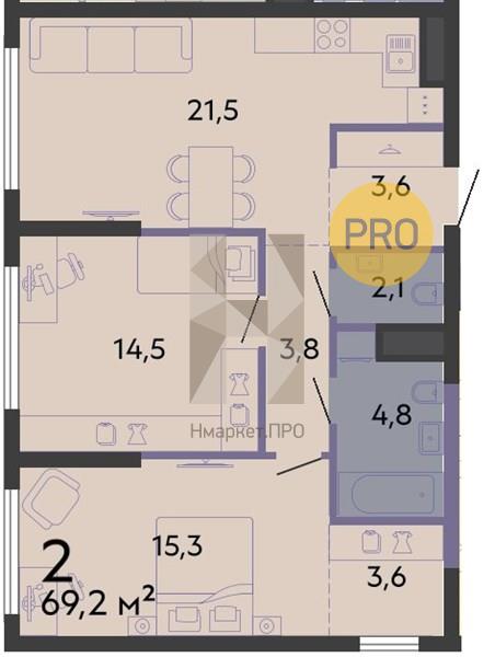 Квартира: 2 к 69,20 кв.м., 5 этаж в комплексе Парк Культуры, 1 очередь, корп.1, сдача: 1кв. , этажей: 32, адрес Екатеринбург г., Базовый пер., д. 1, Застройщик: PRINZIP недвижимость.