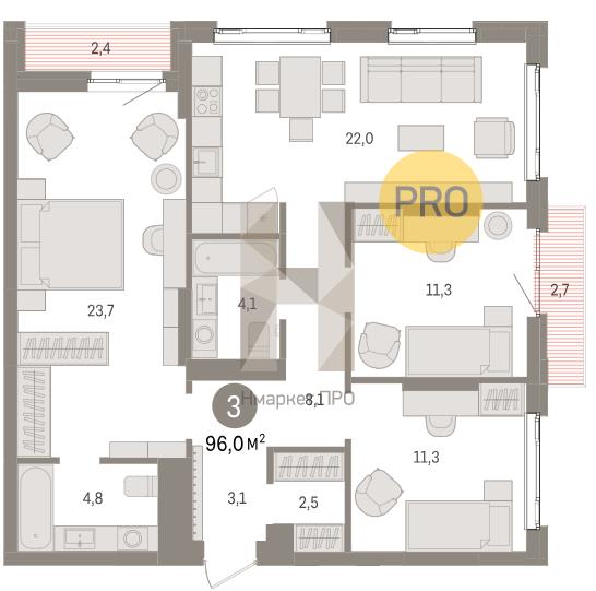 Купить 3-комнатную квартиру, 96.00 м2 № 7440753