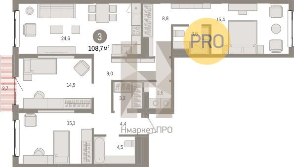 Квартира: 3 к 108,70 кв.м., 3 этаж в комплексе Квартал Траектория, 1 очередь, корп.1.1, сдача: 1кв. , этажей: 25, адрес Екатеринбург г., Билимбаевская ул., д. 1.1, Застройщик: Брусника.