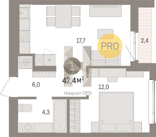 Квартира: 1 к 42,40 кв.м., 4 этаж в комплексе Квартал Траектория, 1 очередь, корп.1.1, сдача: 1кв. , этажей: 25, адрес Екатеринбург г., Билимбаевская ул., д. 1.1, Застройщик: Брусника.