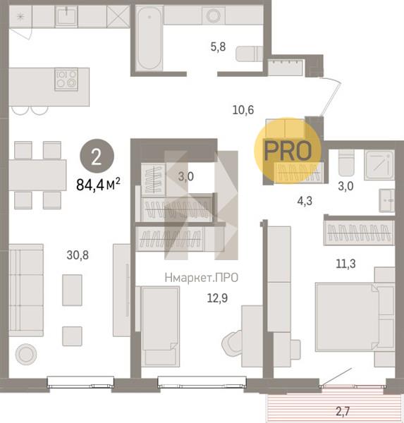 Квартира: 2 к 84,40 кв.м., 4 этаж в комплексе Квартал Траектория, 1 очередь, корп.1.1, сдача: 1кв. , этажей: 25, адрес Екатеринбург г., Билимбаевская ул., д. 1.1, Застройщик: Брусника.