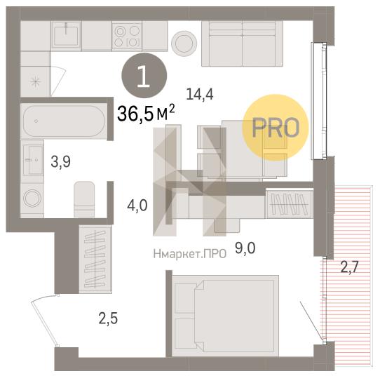 Квартира: 1 к 36,50 кв.м., 7 этаж в комплексе Квартал Траектория, 1 очередь, корп.1.1, сдача: 1кв. , этажей: 25, адрес Екатеринбург г., Билимбаевская ул., д. 1.1, Застройщик: Брусника.