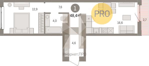 Квартира: 1 к 48,40 кв.м., 5 этаж в комплексе Квартал Траектория, 1 очередь, корп.1.1, сдача: 1кв. , этажей: 25, адрес Екатеринбург г., Билимбаевская ул., д. 1.1, Застройщик: Брусника.
