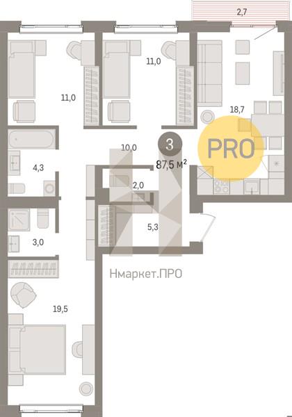 Квартира: 3 к 87,50 кв.м., 3 этаж в комплексе Квартал Траектория, 1 очередь, корп.1.1, сдача: 1кв. , этажей: 25, адрес Екатеринбург г., Билимбаевская ул., д. 1.1, Застройщик: Брусника.