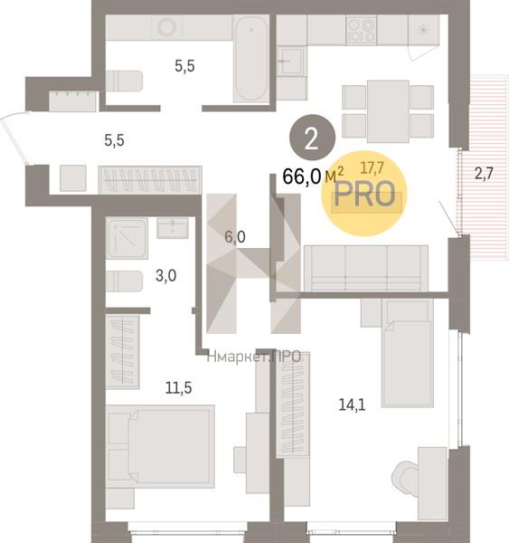 Квартира: 2 к 66,00 кв.м., 4 этаж в комплексе Квартал Траектория, 1 очередь, корп.1.2, сдача: 1кв. , этажей: 16, адрес Екатеринбург г., Билимбаевская ул., д. 1.2, Застройщик: Брусника.