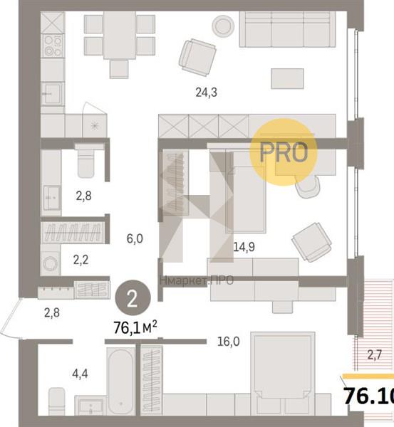 Квартира: 2 к 76,10 кв.м., 5 этаж в комплексе Квартал Траектория, 1 очередь, корп.1.2, сдача: 1кв. , этажей: 16, адрес Екатеринбург г., Билимбаевская ул., д. 1.2, Застройщик: Брусника.