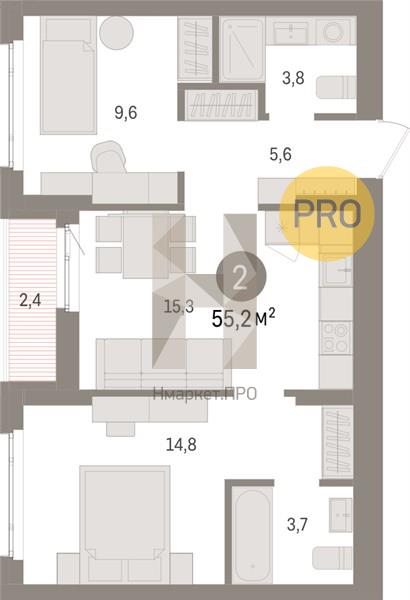 Квартира: 2 к 55,20 кв.м., 2 этаж в комплексе Квартал Траектория, 1 очередь, корп.1.2, сдача: 1кв. , этажей: 16, адрес Екатеринбург г., Билимбаевская ул., д. 1.2, Застройщик: Брусника.
