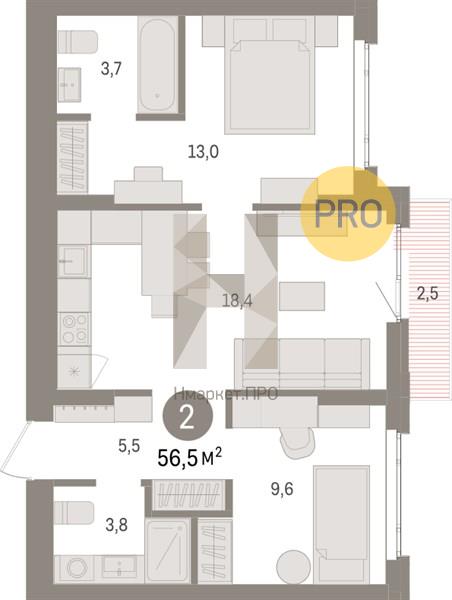 Квартира: 2 к 56,50 кв.м., 2 этаж в комплексе Квартал Траектория, 1 очередь, корп.1.2, сдача: 1кв. , этажей: 16, адрес Екатеринбург г., Билимбаевская ул., д. 1.2, Застройщик: Брусника.