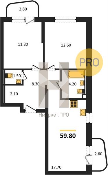 Квартира: 2 к 59,80 кв.м., 12 этаж в комплексе Солнечный, 6 очередь, корп.11.1, сдача: 4кв. , этажей: 15, адрес Екатеринбург г., Чемпионов ул., , Застройщик: ГК ЭТАЛОН.