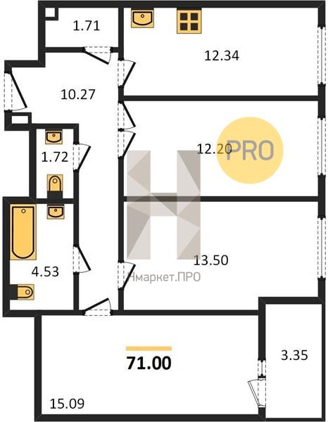 Квартира: 3 к 71,00 кв.м., 13 этаж в комплексе Комсомольская 67, 1 очередь, корп.1.3, сдача: 3кв. , этажей: 15, адрес Екатеринбург г., Комсомольская ул., д. 67, Застройщик: Первостроитель.