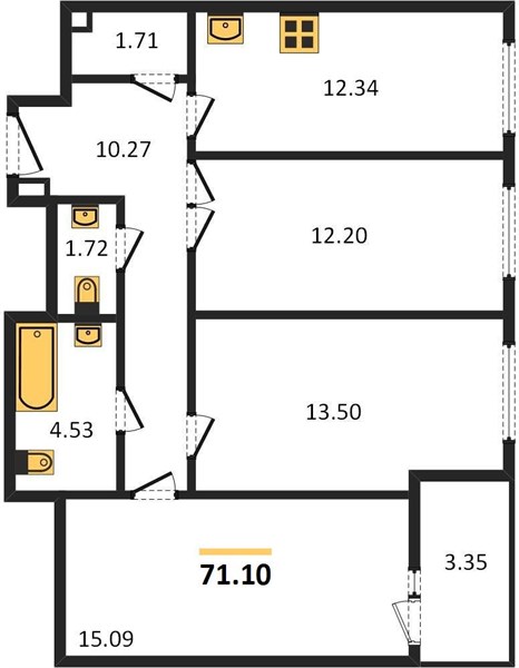 Квартира: 3 к 71,10 кв.м., 15 этаж в комплексе Комсомольская 67, 1 очередь, корп.1.3, сдача: 3кв. , этажей: 15, адрес Екатеринбург г., Комсомольская ул., д. 67, Застройщик: Первостроитель.