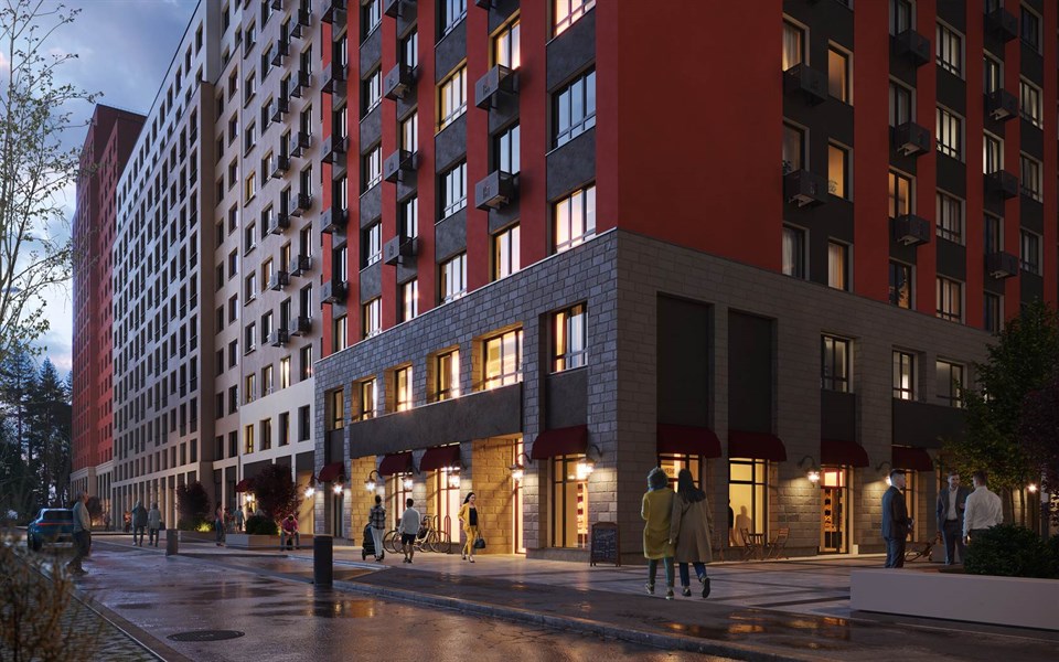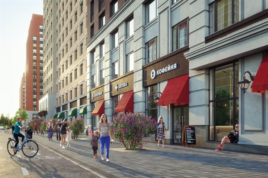 Дома и подъезды квартала выполнены в архитектурном стиле Нью-Йорка – ар-деко. При проектировании квартала создатели проекта вдохновлялись легендарными небоскрёбами – Эмпайр-стейт билдинг и Рокфеллеровским центром. Центральная площадь — это общественное пространство для жителей квартала. Здесь расположен фонтан, ресторан с летней верандой и торговая галерея.