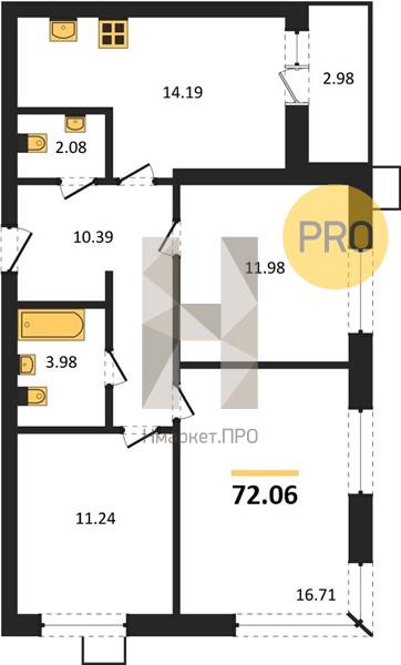 Квартира: 3 к 72,06 кв.м., 11 этаж в комплексе Riverside, 2 очередь, корп.4, сдача: 2кв. , этажей: 24, адрес Екатеринбург г., Крауля ул., , Застройщик: Унистрой.