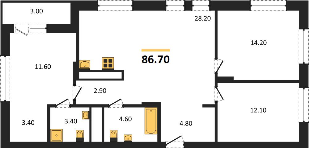 Квартира: 3 к 86,70 кв.м., 3 этаж в комплексе Riverside, 1 очередь, корп.2, сдача: 4кв. , этажей: 5, адрес Екатеринбург г., Крауля ул., , Застройщик: Унистрой.