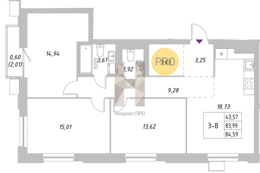 Квартира: 3 к 84,59 кв.м., 7 этаж в комплексе Riverside, 2 очередь, корп.6, сдача: 2кв. , этажей: 8, адрес Екатеринбург г., Крауля ул., , Застройщик: Унистрой.