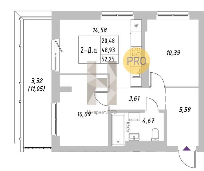 Квартира: 2 к 52,25 кв.м., 9 этаж в комплексе Riverside, 2 очередь, корп.3, сдача: 2кв. , этажей: 10, адрес Екатеринбург г., Крауля ул., , Застройщик: Унистрой.