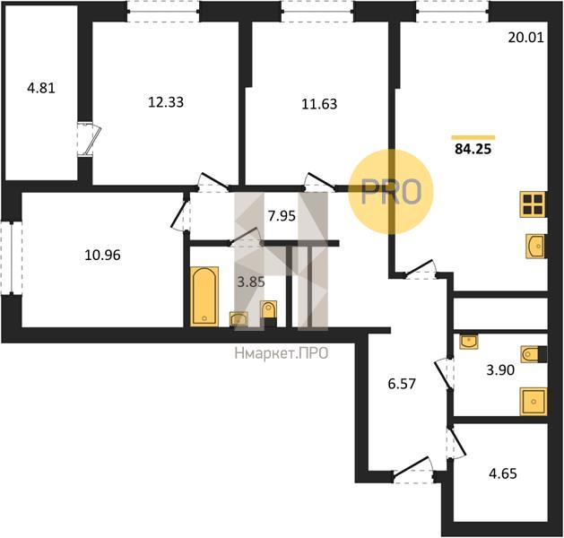 Квартира: 3 к 84,25 кв.м., 4 этаж в комплексе Куйбышева 100, 1 очередь, корп.1.2, сдача: 4кв. , этажей: 24, адрес Екатеринбург г., Куйбышева ул., д. 100, Застройщик: Премьерстрой.