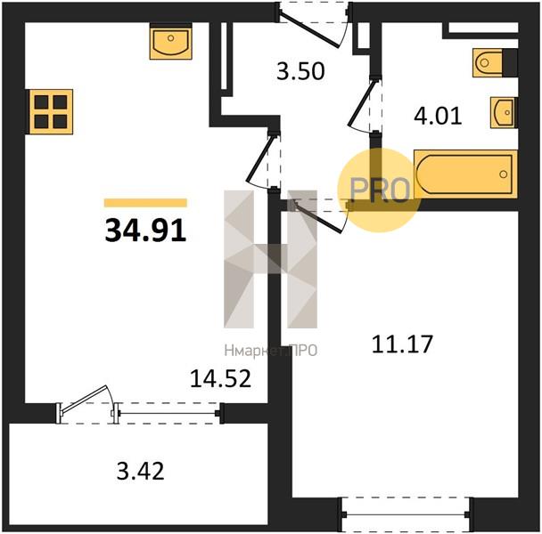 Квартира: 1 к 34,91 кв.м., 2 этаж в комплексе Динамика, 2 очередь, корп.3, сдача: 3кв. , этажей: 6, адрес Екатеринбург г., Малышева ул., д. 145, Застройщик: Стройтэк.