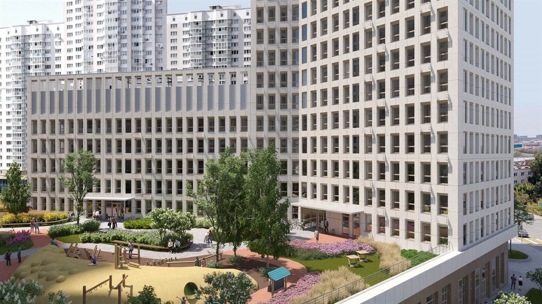 Уютный двор без доступа автомобилей объединит в себе тенистые лаунж-зоны, многофункциональные спортивные площадки и детские игровые зоны для разных возрастов. Неглубокий ручей и фонтан в центре привнесут в проект атмосферу загородной жизни.