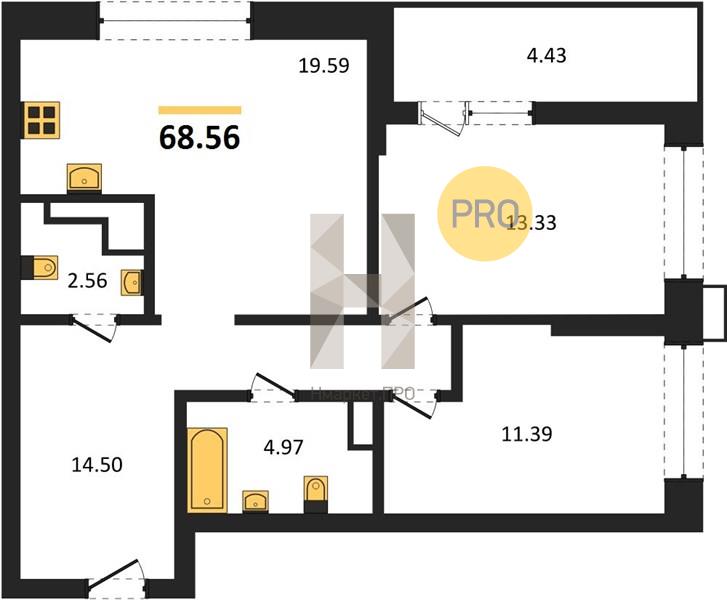 Квартира: 2 к 70,77 кв.м., 14 этаж в комплексе Сибирская калина, 1 очередь, корп.1 (1,2,3,4 секции), сдача: 2кв. , этажей: 25, адрес Екатеринбург г., Монтерская ул., , Застройщик: Баланс Девелопмент.