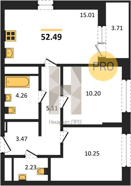 Квартира: 2 к 52,49 кв.м., 12 этаж в комплексе Новокольцовский, 1 очередь, корп.5 (2-6 секции), сдача: 2кв. , этажей: 16, адрес Екатеринбург г., Новокольцовская ул., , Застройщик: Синара.