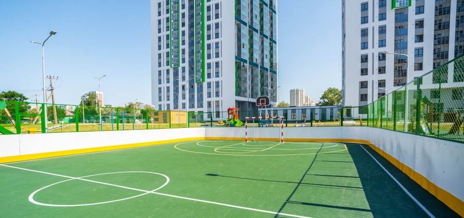 В состав комплекса входят: фитнес-клуб с олимпийским бассейном, баскетбольная и волейбольная площадки, футбольное поле (на зимний период превращается в ледовую арену), детские игровые и спортивные площадки, велодорожки и прогулочные зоны, салон красоты, кафе, торговая галерея, банк, детский сад с собственной территорией. Помимо многоуровневой парковки на 362 места для жителей дома, запроектированы удобные и вместительные гостевые паркинги.
