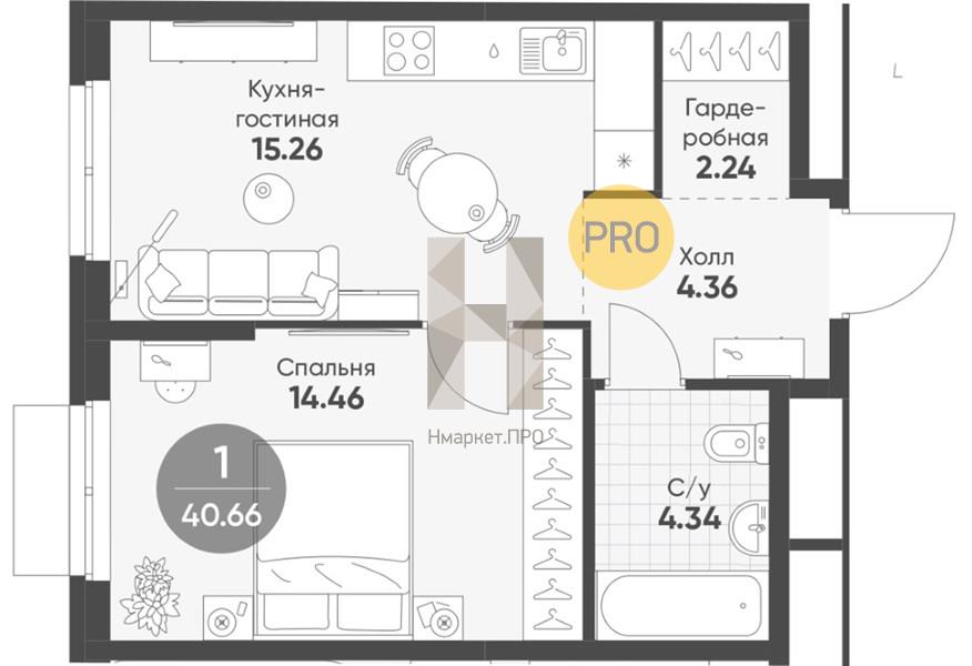 Квартира: 1 к 40,66 кв.м., 5 этаж в комплексе Rauta, 5 очередь, корп.6, сдача: 3кв. , этажей: 25, адрес Екатеринбург г., Пехотинцев ул., д. 2, корпус а, Застройщик: ГК ЭТАЛОН.