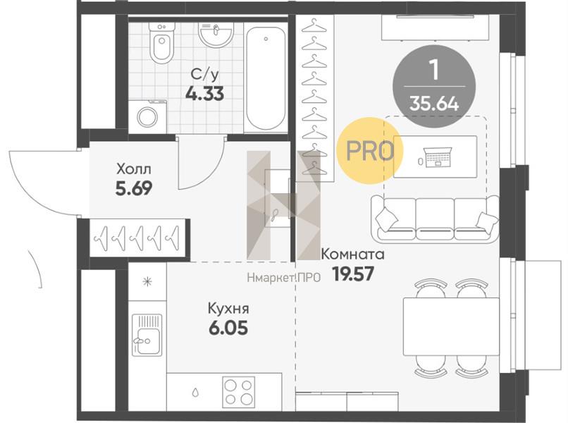 Квартира: 1 к 35,64 кв.м., 4 этаж в комплексе Rauta, 5 очередь, корп.6, сдача: 3кв. , этажей: 25, адрес Екатеринбург г., Пехотинцев ул., д. 2, корпус а, Застройщик: ГК ЭТАЛОН.