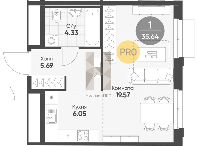 Квартира: 1 к 35,64 кв.м., 7 этаж в комплексе Rauta, 5 очередь, корп.6, сдача: 3кв. , этажей: 25, адрес Екатеринбург г., Пехотинцев ул., д. 2, корпус а, Застройщик: ГК ЭТАЛОН.