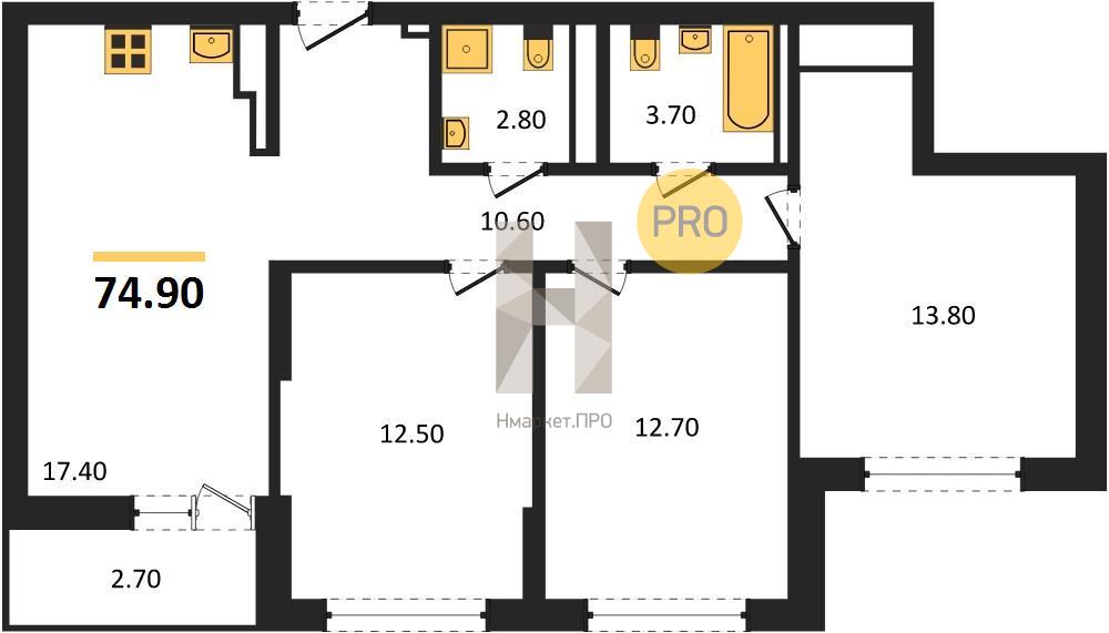 | Общая площадь: | 74.90 м2 |