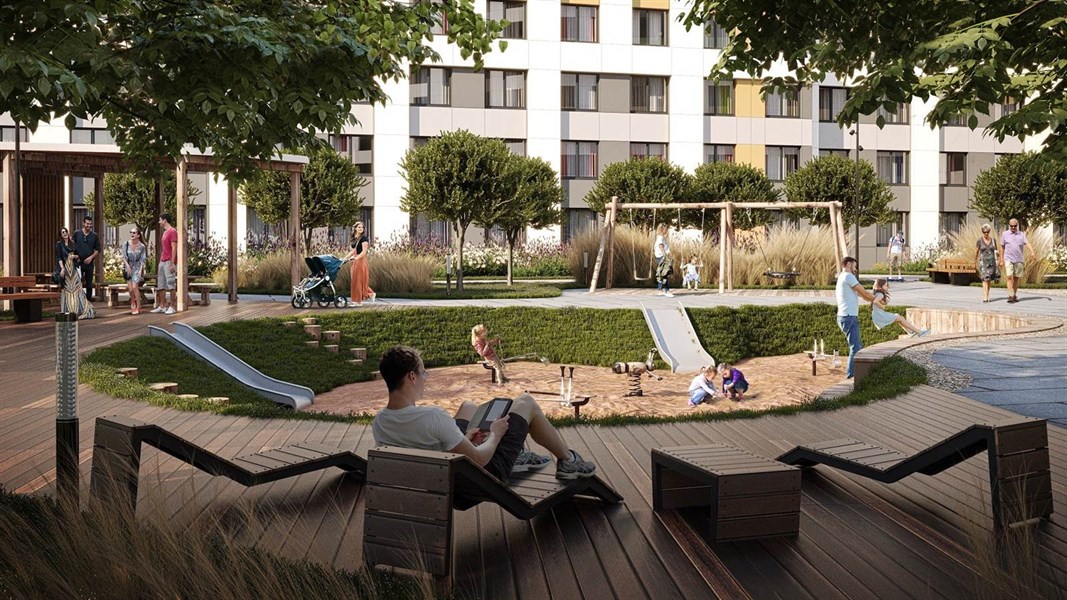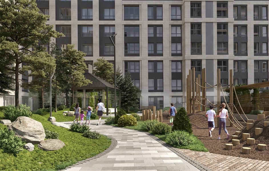 Во дворе будут обустроены детские и спортивные площадки, лаунж-зоны для отдыха взрослых, будут разбиты клумбы, посажены деревья и кустарники, установлена уличная мебель, детские горки, игровые комплексы и качели. Все элементы будут сделаны из дерева, так как оно экологичнее пластика и устойчиво к морозам.
