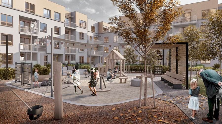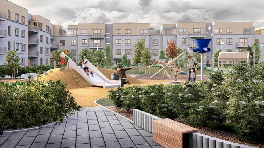 Территория комплекса озеленена - деревья и кустарники, пешеходные дорожки вместо шумных автомобилей, обеспечивает приватность и закрыта от посторонних. Здесь будут функционировать коммерческие пространства с кафе и продуктовыми магазинами, детский образовательный центр, детские площадки для разных возрастных категорий и зоны воркаута.