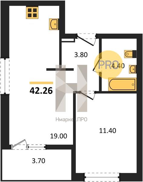 Квартира: 1 к 42,26 кв.м., 9 этаж в комплексе Движение, 1 очередь, корп.1, сдача: 4кв. , этажей: 12, адрес Екатеринбург г., Проходной пер., д. 1в/2, Застройщик: Астон Групп.