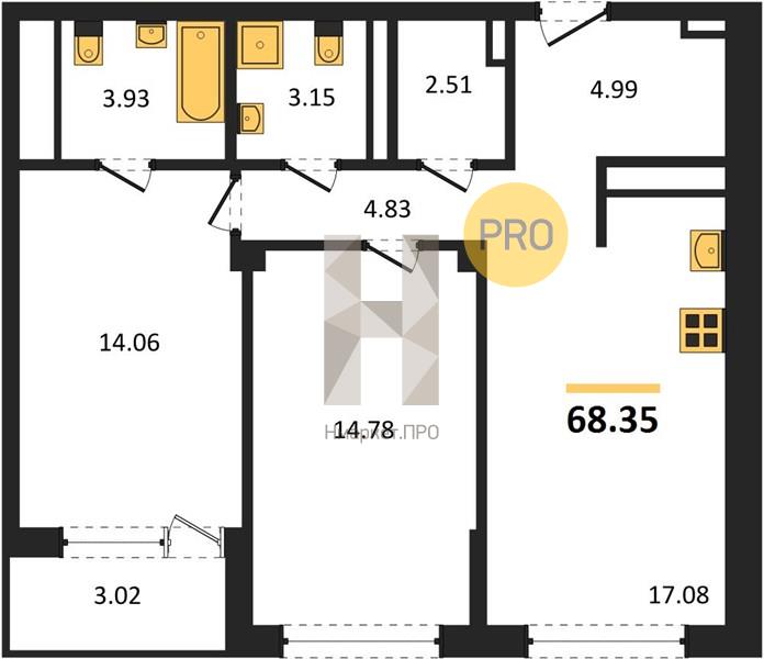 Квартира: 2 к 68,35 кв.м., 24 этаж в комплексе Авангард 3.0, 1 очередь, корп.1, сдача: 4кв. , этажей: 26, адрес Екатеринбург г., Раевского ул., , Застройщик: АтомСтройКомплекс.