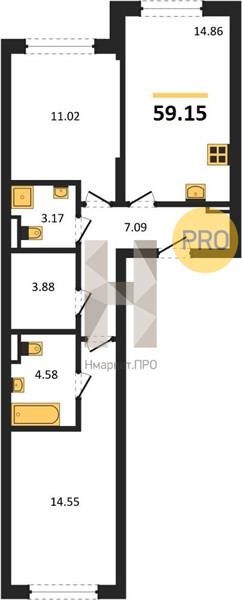 Квартира: 2 к 59,15 кв.м., 5 этаж в комплексе Уральский сад, 2 очередь, корп.Квартал Парковый, сдача: 4кв. , этажей: 21, адрес Совхозный п., Ротная ул., , Застройщик: Страна Девелопмент.
