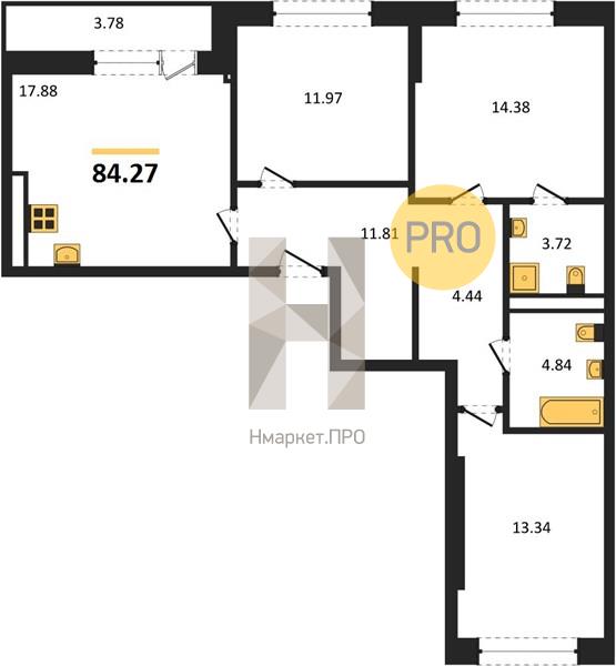 Квартира: 3 к 84,27 кв.м., 3 этаж в комплексе Ривер Парк 3, 3 очередь, корп.2, сдача: 2кв. , этажей: 24, адрес Екатеринбург г., Щербакова ул., , Застройщик: Призвание.