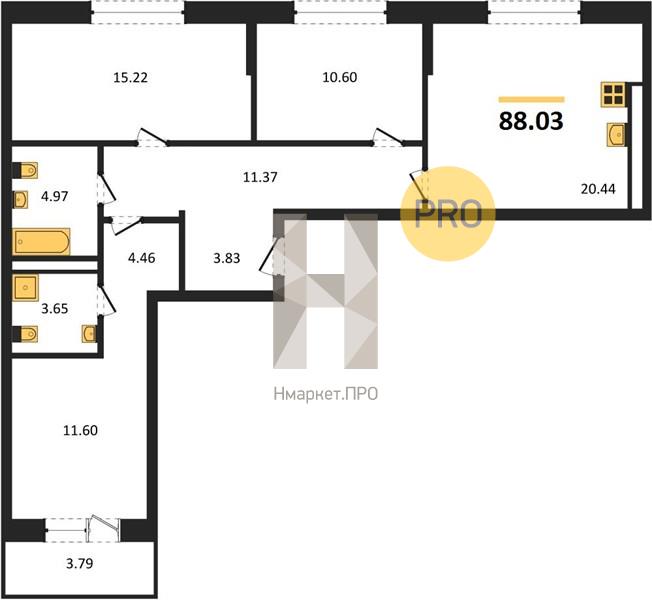Квартира: 3 к 88,03 кв.м., 3 этаж в комплексе Ривер Парк 3, 3 очередь, корп.1, сдача: 1кв. , этажей: 24, адрес Екатеринбург г., Щербакова ул., д. 1, Застройщик: Призвание.